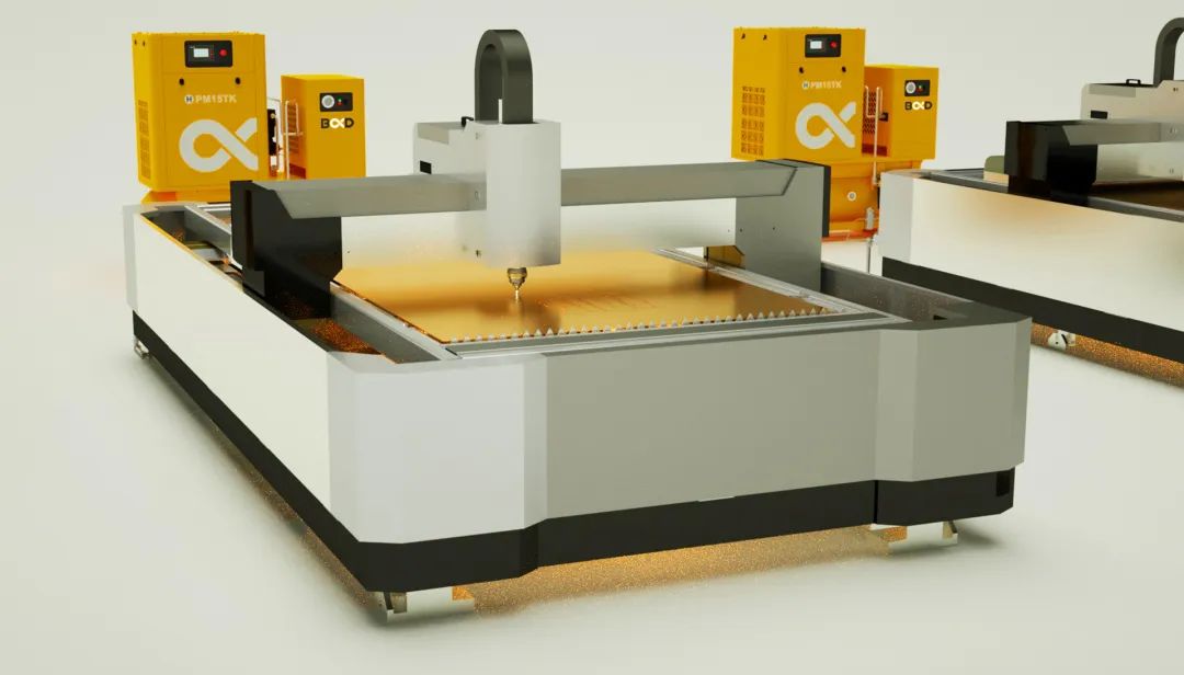 對于不采用壓縮空氣而采用氮氣或氧氣作為輔助氣體的激光切割機,仍然要配一臺流量很小的空氣壓縮機提供氣缸動力氣源,不過只需要的是6-7bar 的常壓氣源。